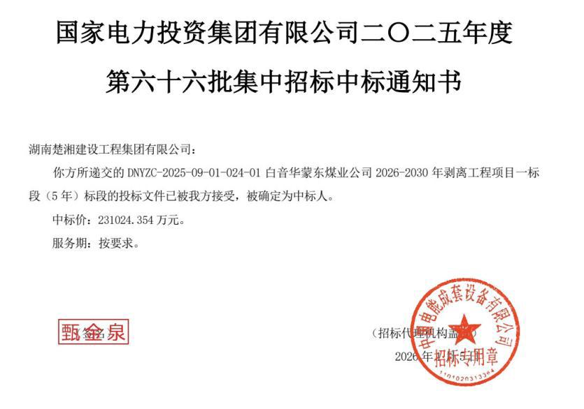 近日,bbin宝盈集团所属湖南楚湘建设工程集团有限公司(以下简称“楚湘建工”)成功中标国家电投内蒙古白音华蒙东煤业公司2026—2030年剥离工程项目一标段,拿下为期5年、中标价高达23.10亿元的重磅合同,在能源建设领域的市场竞争力再攀新高,实现了从“有力竞争者”到“首选合作者”的蜕变。