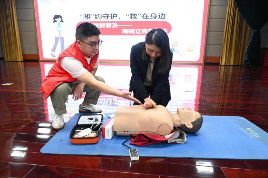 在集团总部举行的急救技能培训中,湘雅口腔医院专家团队首先进行了简短的口腔健康科普。随后,急救专家结合一线岗位实际,系统讲解心脏骤停、气道异物梗阻、突发晕厥等急症的识别与处置要点。实操环节聚焦AED规范使用和海姆立克急救法,讲师分步演示成人、儿童、婴儿三类人群的操作手法,并组织职工分组练习,逐人纠正动作细节。与此同时,专家团队为职工提供免费口腔检查、龋齿及牙周疾病筛查、一对一咨询问诊,并科普了日常清洁、牙齿矫正、种植牙养护等知识。